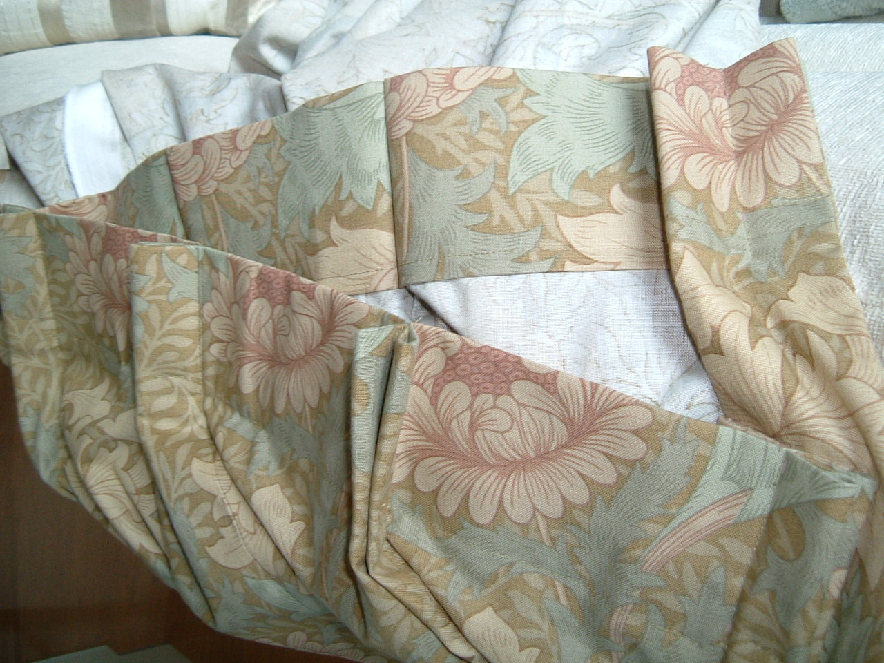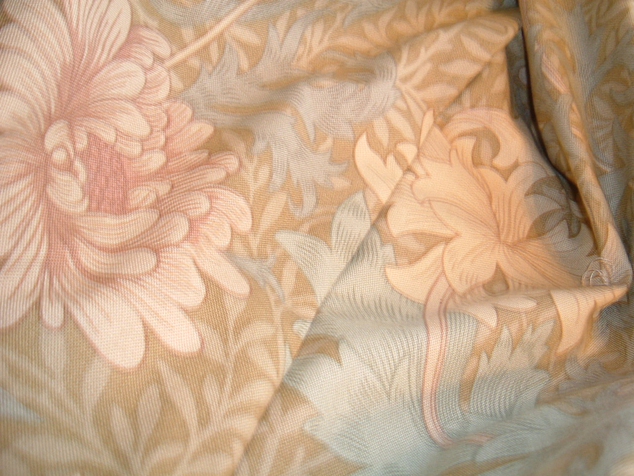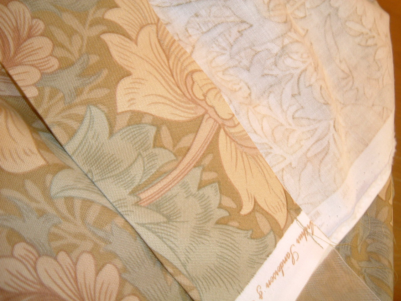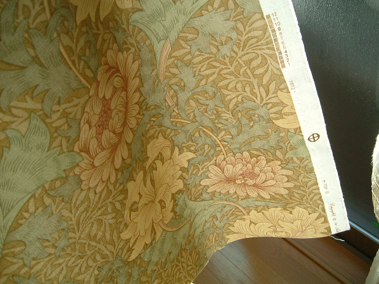絵柄で凄く悩んだけど、このクリサンティマムという菊をあしらった模様にしました。モリスの1887年の作品です。色は3色で、この私の選んだ色以外に、インディゴブルーとグリーンがあります。